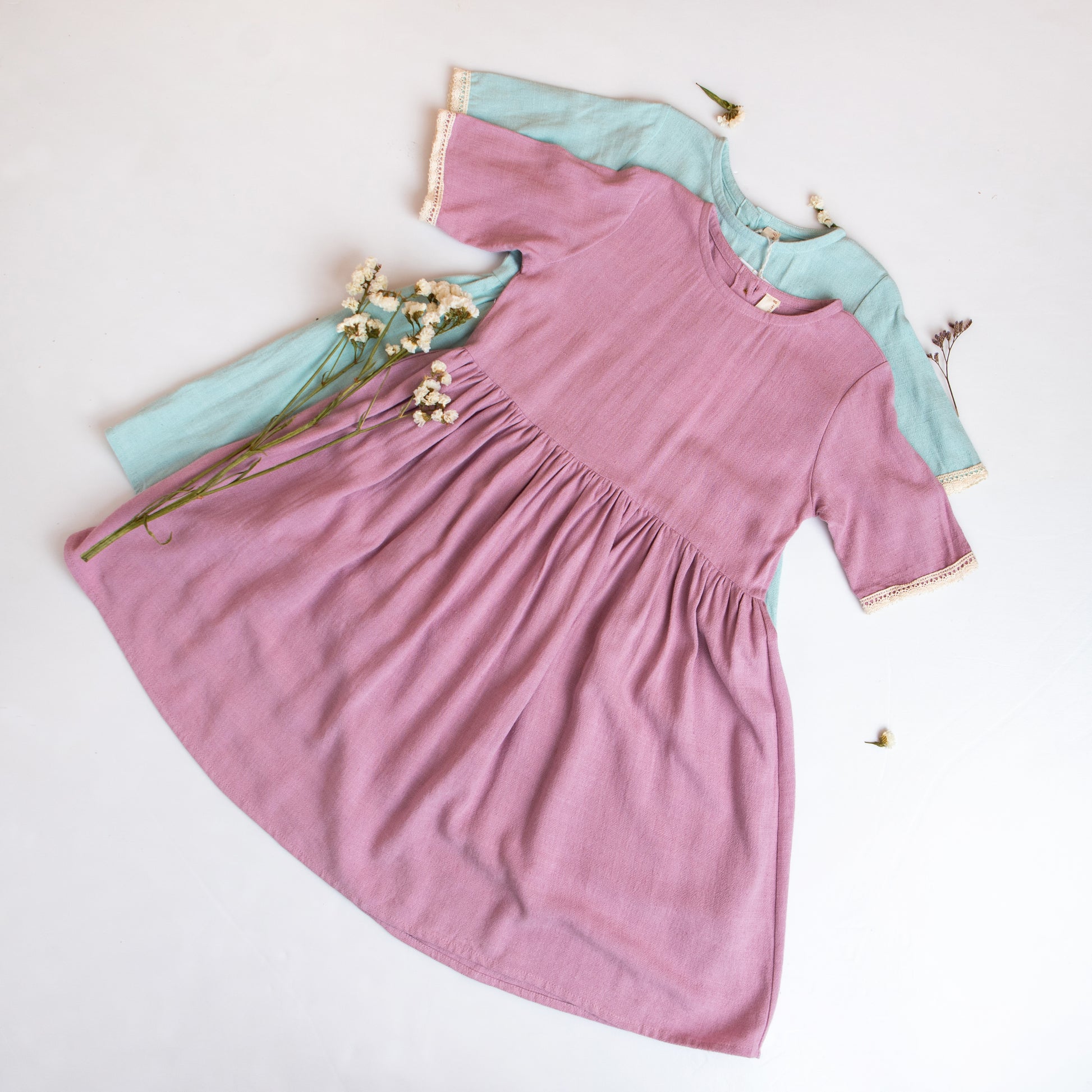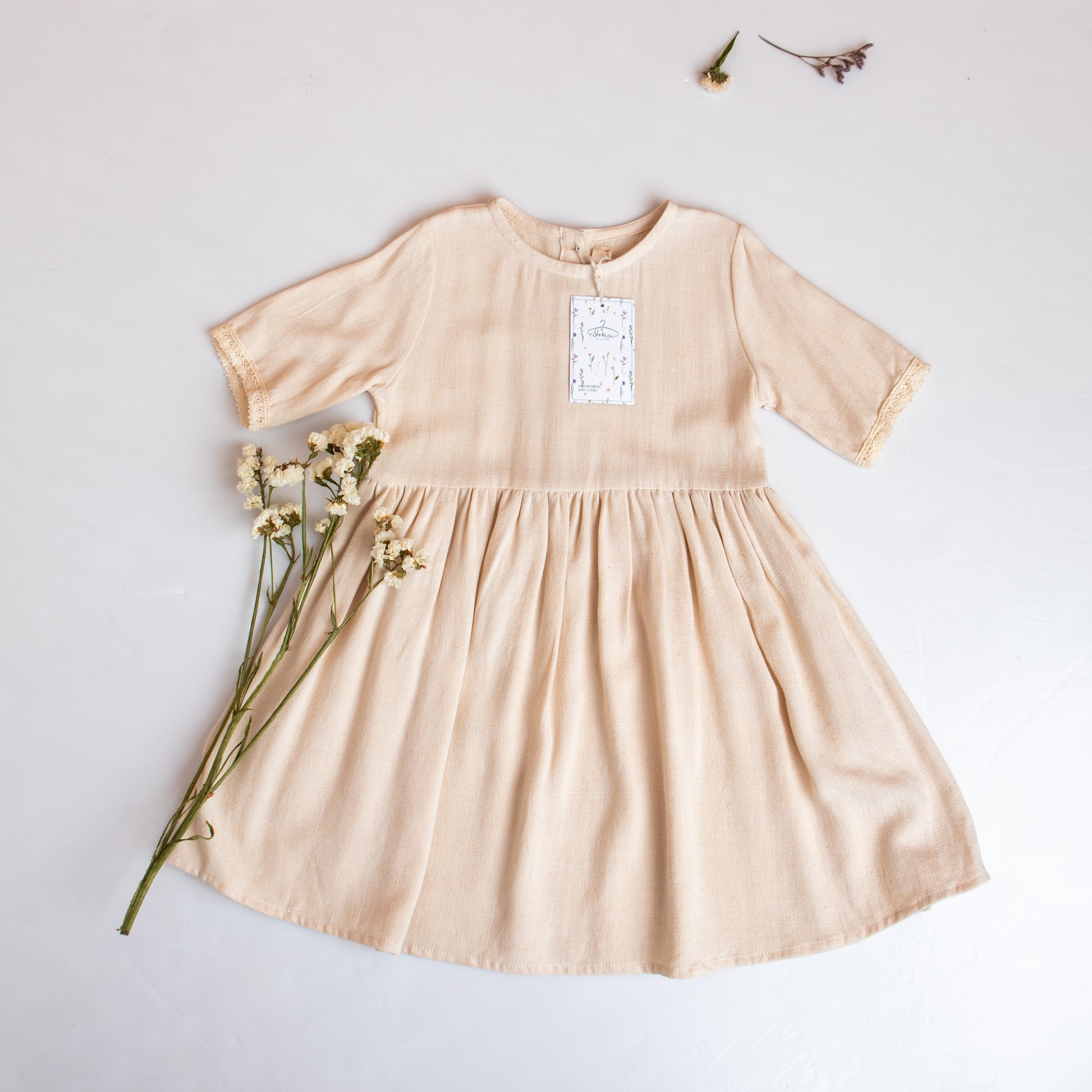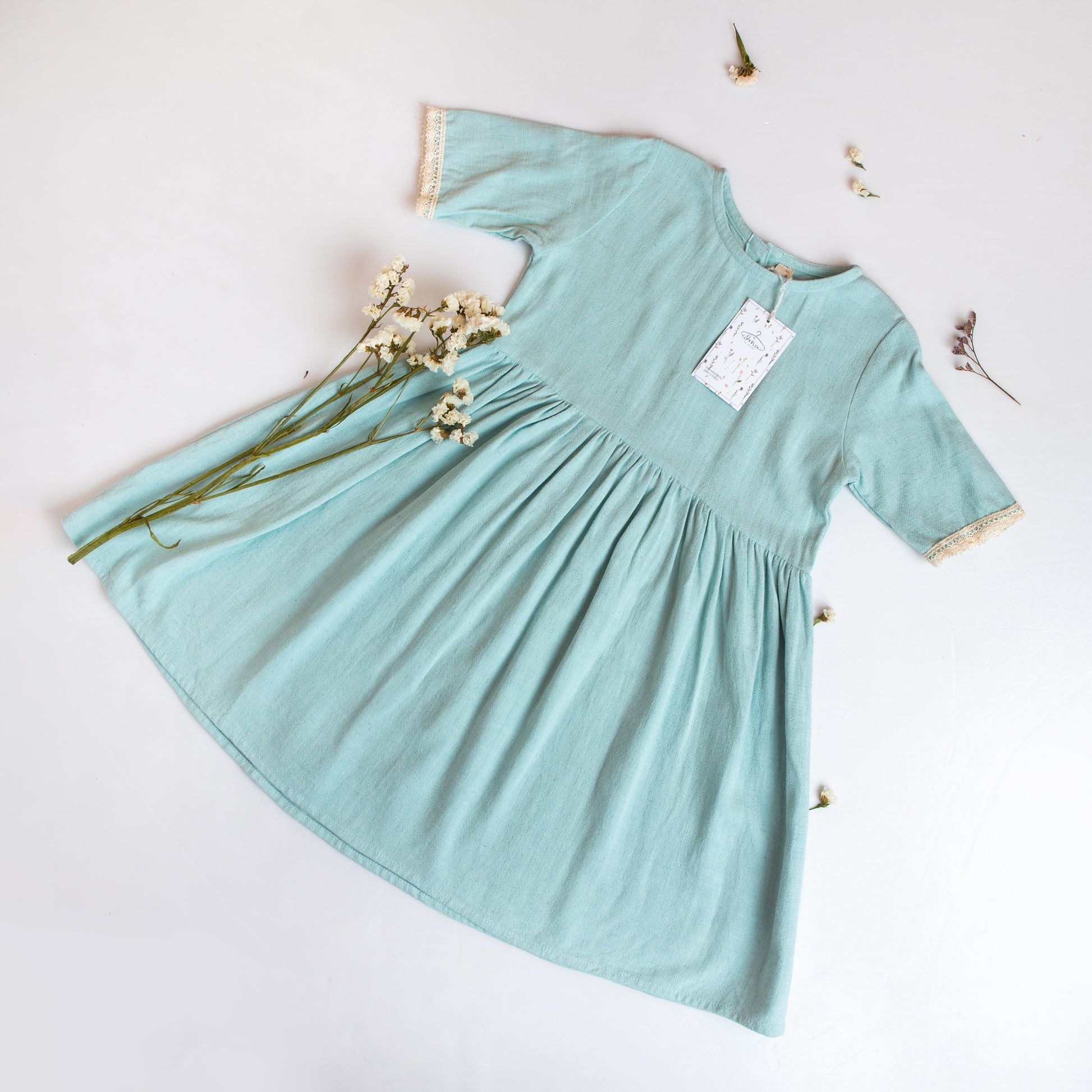 Lindo vestido cuello redondo, botones en la espalda, manga corta con un linda blonda de algodón, largo de falda debajo de la rodilla