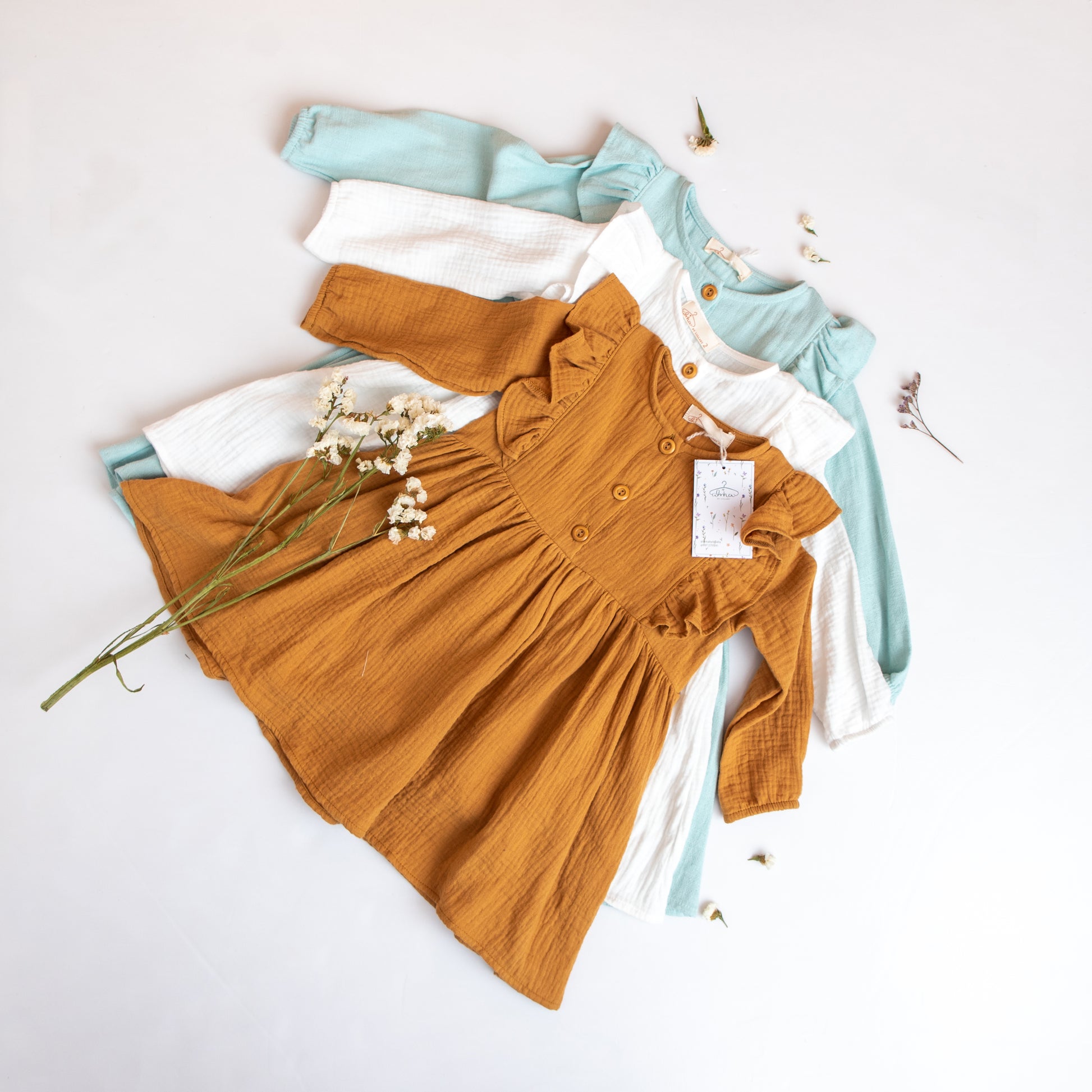 Vestido con manga larga con puño elástico suave, botones en el pecho y bobos de dobladillo, falda larga hasta la rodilla.